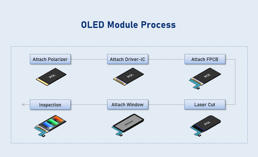 A display module manufacturing line requires the application of various disciplines of engineering, from fundamental material science all the way to applied mechatronics. Before diving into the equipment and materials that are the beating heart of a module line, it’s important to understand the process that engineers envision feeding materials into and flowing partially- or fully-completed components out to subsequent steps.