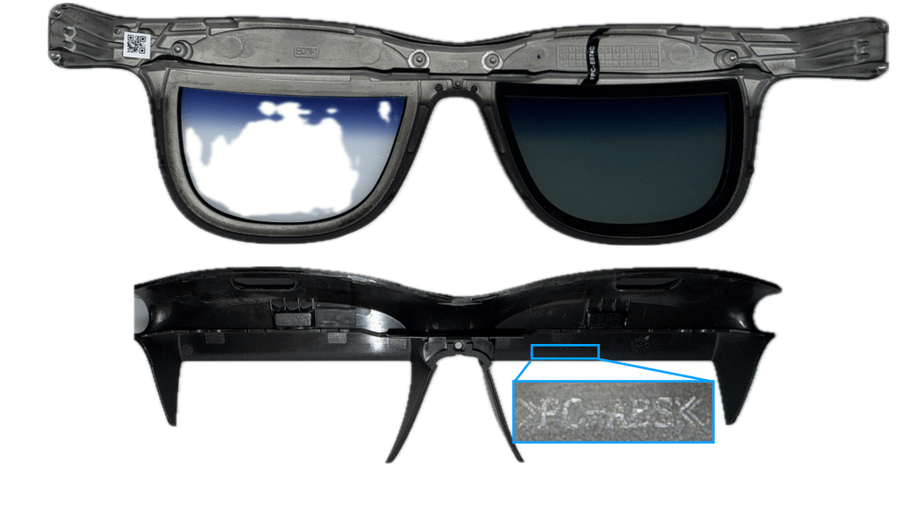 We’ll start this tear-down with the outer face-plate which houses two front lenses, likely polycarbonate with some graded tinting towards the brow. The plate itself seems to be the same AZ91D magnesium alloy that the outer halves of the temple are made of, but the markings are not easily found anywhere on the piece. The inner portion of the glasses is a plastic piece, seemingly of a PC-ABS blend though even this was very poorly marked – I will give Viture overall low marks for lacking these key manufacturing marks on their components whereas RayNeo and Xreal seem to find spots on the limited real estate just fine…