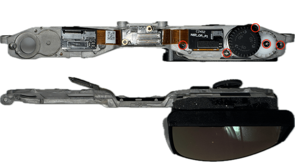As we move on to the optical modules and central frame, we find a single PCB which houses the connectors for the left and right temple flexes, as well as the separate 2x optical modules (OMs) mounted to the magnesium alloy frame using 5x Phillips screws marked in red above. It’s great to see this inner metallic component as the main frame – while surely more expensive than an injection molded plastic, it allows for the significant heat that is generated by the displays to be removed much more effectively during operation.