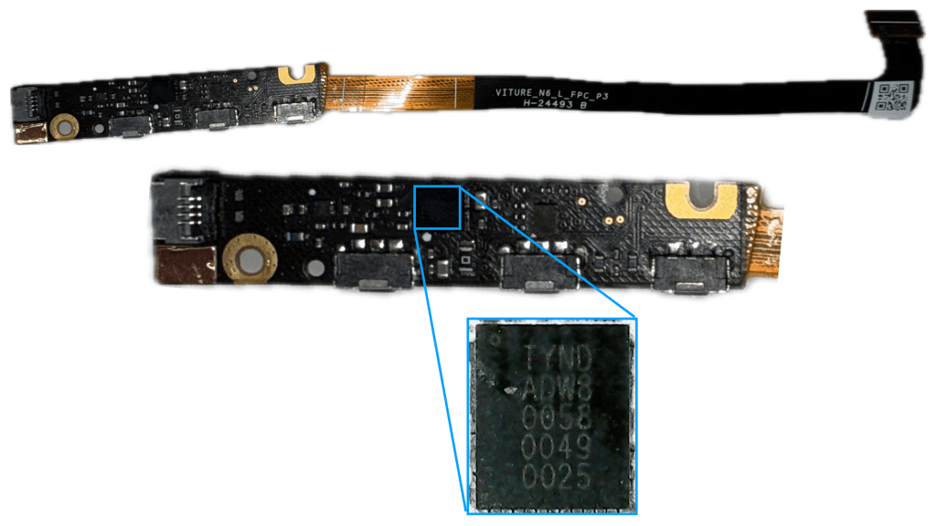 The central board is a rigid flex board housing primarily power and data connectors, but there is also an inertial measurement unit (IMU) on the central rigid board – some quick searching shows this to likely be a TDK ICM-42688-P 6-axis IMU, which allows for the 3DoF head tracking via the SpaceWalker app when connected to a device with a capable-enough processor. It’s great to see this already on the bill of materials (BoM) for these glasses so that when much more powerful onboard processing becomes standard for Viture, native 3DoF (and possibly 6DoF) support is going to follow.