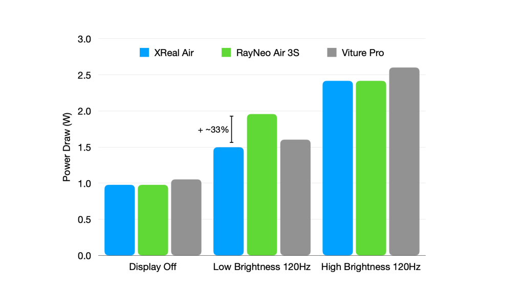 Not to belabor the point, but it was pretty interesting to see that the headsets themselves all have pretty similar power draws when off / at low brightness / at high brightness. The only exception seems to be RayNeo’s low brightness panel setting, which does draw a considerable amount more than the two Sony panels in the Xreal and Viture headsets – about 33% more.