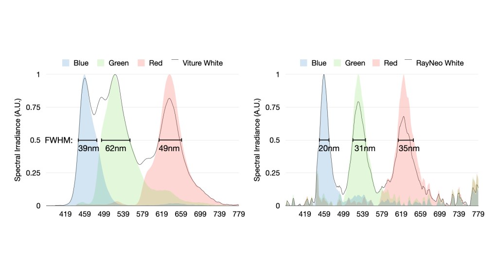 The other interesting thing is just how much purer the emission spectra of the RGB emitters in the RayNeo panel seem to be vs. the Sony panels in the Viture Pros and Xreals – B and G are almost half full-width half max (FWHM) and R is also quite a bit lower at 35nm vs. 49nm respectively. This is why RayNeo claims to cover almost 100% of the DCI-P3 color space and after seeing these differences, I’m quite convinced that display geeks (primarily the target audience of these headsets so far…) will gravitate towards headsets with these panels moving forward.