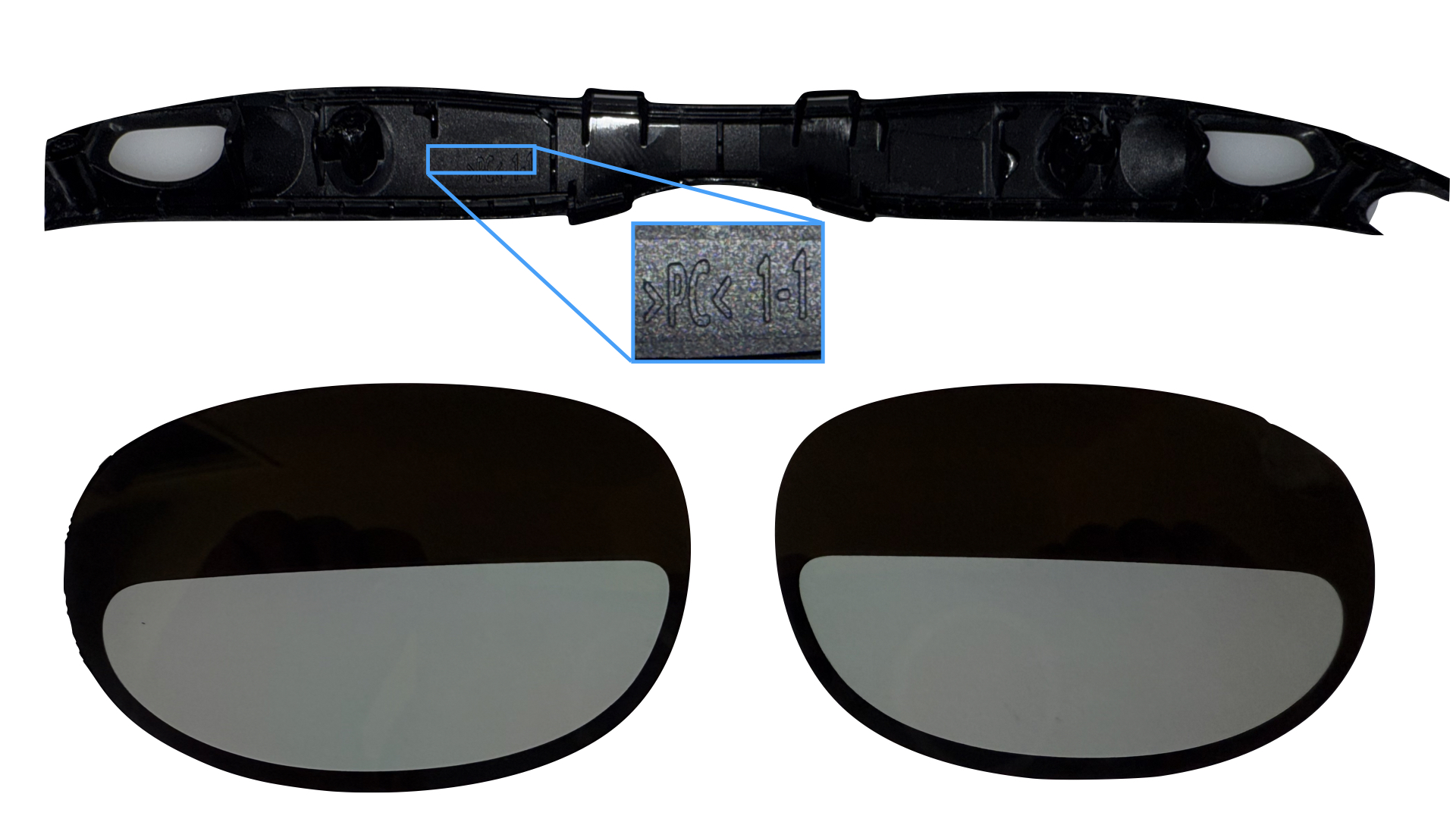 We’ll start this tear-down with the outer coverings around the nose bridge which houses the two static-tint front lenses. The lenses are likely polycarbonate, but we don’t have any clear material markings here to go off of. What we do know however is that the plastic coverings themselves are a single injection molded piece of Polycarbonate (PC) with some brass inserts for all the screws holding the pieces together. This PC is also what the plastic temples are made of, so we won’t touch on those materials too much…