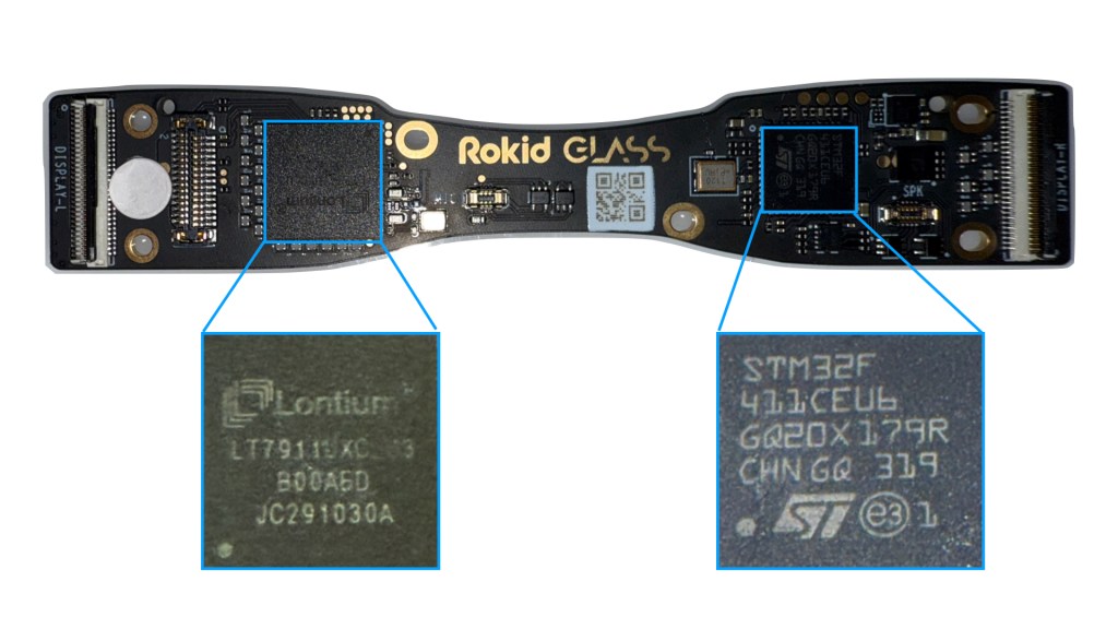 The PCB sports a sleek ‘Rokid Glass’ gold plating which was either (a) a very early name for the device before marketing said no or (b) a preview of things to come when their true AR ambitions were fulfilled. The top-side of our board, which houses the ZIF connectors for both OLED microdisplays, also has the 2 main ICs of interest – the DDIC from our seemingly favorite vendor Lontium (the same LT7911UXC we’ve seen in almost all glasses so far) and the microprocessor, which is an STMicroelectronics STM32F411CEU6. This CPU is a slightly higher performance version than what we previously saw in the Viture teardown, with a roughly 25% higher clock rate (100 MHz vs 80 MHz). There was no noticeable difference in performance with this ‘better’ processor since we are mostly letting the phone/console/laptop do most of the rendering and the headsets are only passing that information to the OLED microdisplays…