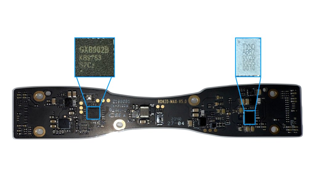 As we move on to the optical module and central frame, we can see how much Rokid was able to pack in to just the front of the glasses – we not only have the displays and lens modules, but our microphone, inertial measurement unit (IMU) and the central PCB which houses the display driver (DDIC), central processor, audio IC, voice processor, and much more… frankly I struggled to see any other relevant