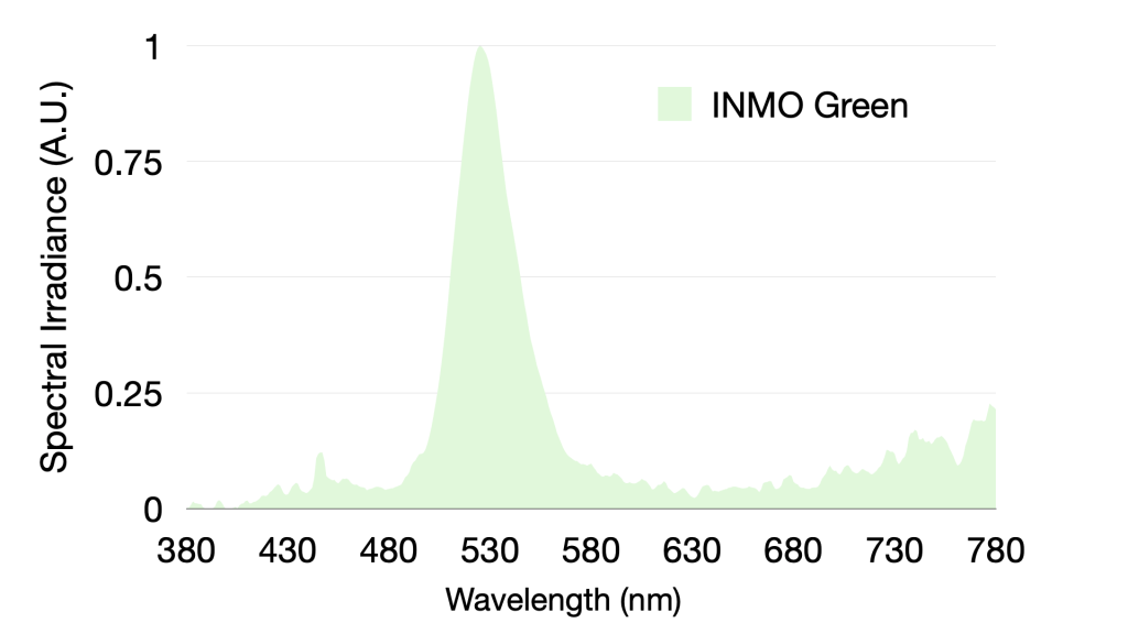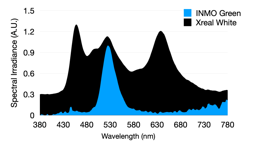 When we compare INMO’s output spectrum to the white spectra of display glasses like Xreals, we can see the lack of characteristic emission in the 450nm and 640nm blue and red regions. The actual FWHM of INMO’s green emission is ~34nm, more inline with the excellent green emission from RayNeo’s SeeYA OLED panel.