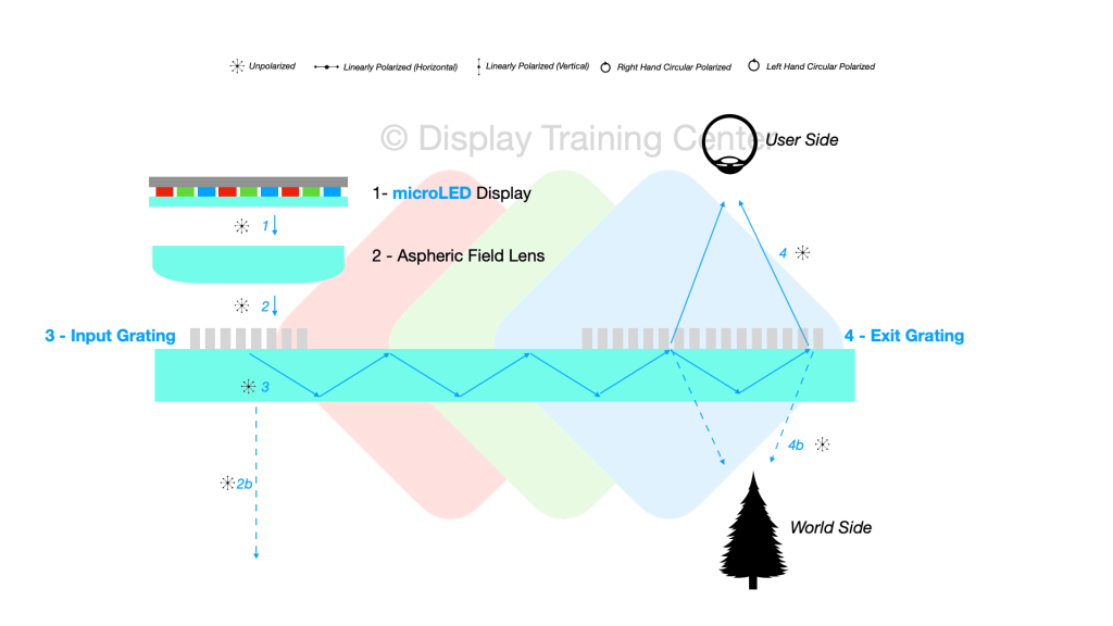 Another major difference is the lack of passive polarization control through the optics. Since we have unpolarized light emitted from the display in (1), we continue to output similar unpolarized light through the lens elements that magnify our image in (2) and then the input (3) and output (4) gratings.