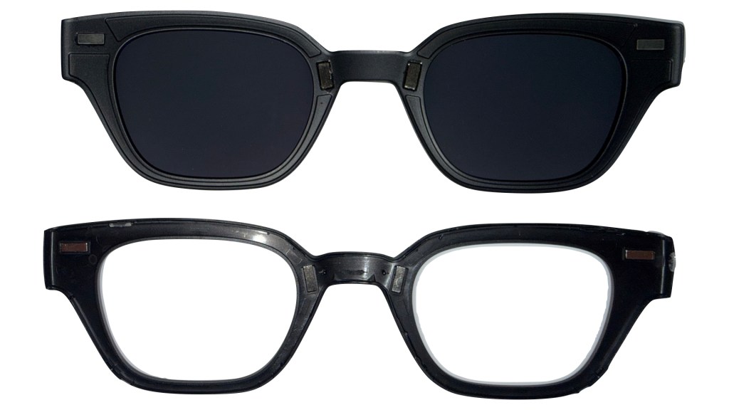 The front faceplate that we removed is a simple injected piece of plastic, but without tooling marks to tell us when it was made or out of what material… it’s likely some polycarbonate or ABS, but it would still be nice to see this in the tooling marks so that should these ever be recycled (big if), we can easily tell how to sort this resin. There are also a 4 rare earth magnets – 2 at each temple, and 2 above the nose bridge – on the inside of the faceplate that magnetically connect us to the included shade. Who doesn’t love a nice magnetic clip attachment?