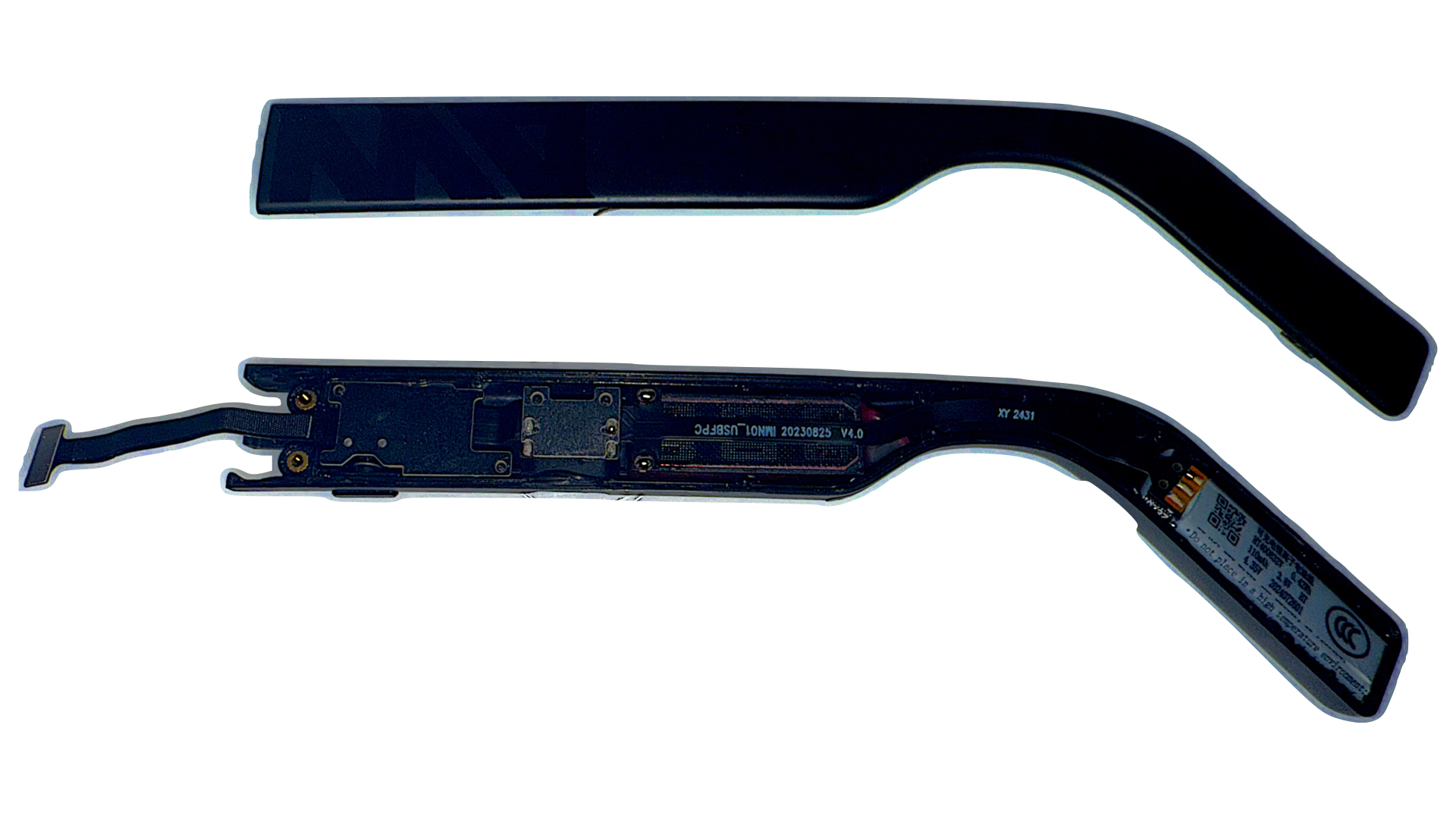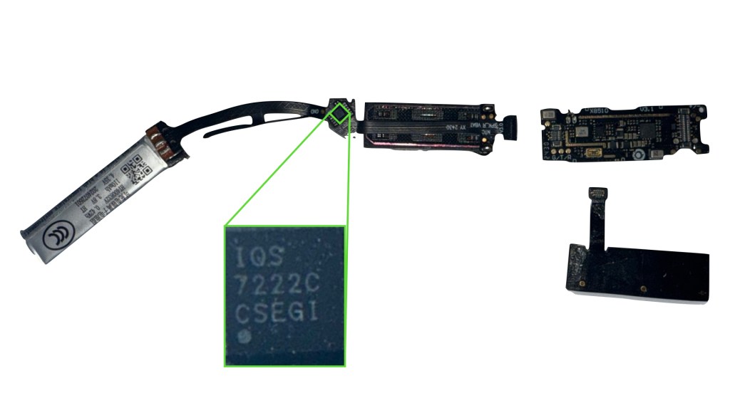 The single flex that connects the battery and audio modules to the main PCB actually has two surprising elements that weren’t seen on the left temple – a small offshoot flex between the battery and audio modules that is laminated on the bottom of the right temple, and a small IC highlighted in green. While doing my homework, I found this interesting teardown from a Chinese blogger Wen5 explaining that this part of the flex does capacitive wear detection. If true, this is an interesting low-cost solution to the battery-saving features that ToF sensing is supposed to achieve – instead of bouncing a laser on your face to see if you’re wearing the glasses, why not just see if the glasses are on your ear? It will also make it much harder for people like me to force the display on during teardowns…