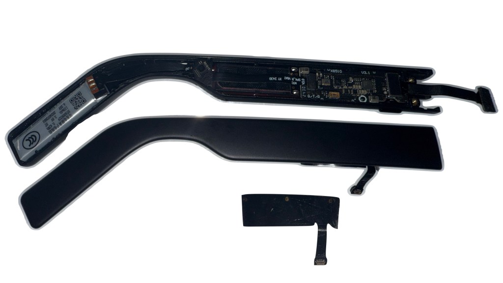 The right temple is a little more repair friendly, with independent modules and connectors for each. While everything is generally nested in the inner part of the right temple, there is one component – the touch input module – which is laminated to the outer half of the temple. I suspect we’ll see this type of component in more and more of these standalone glasses, so we’ll keep an eye for the manufacturers moving forward.