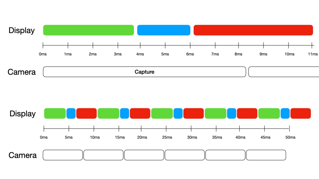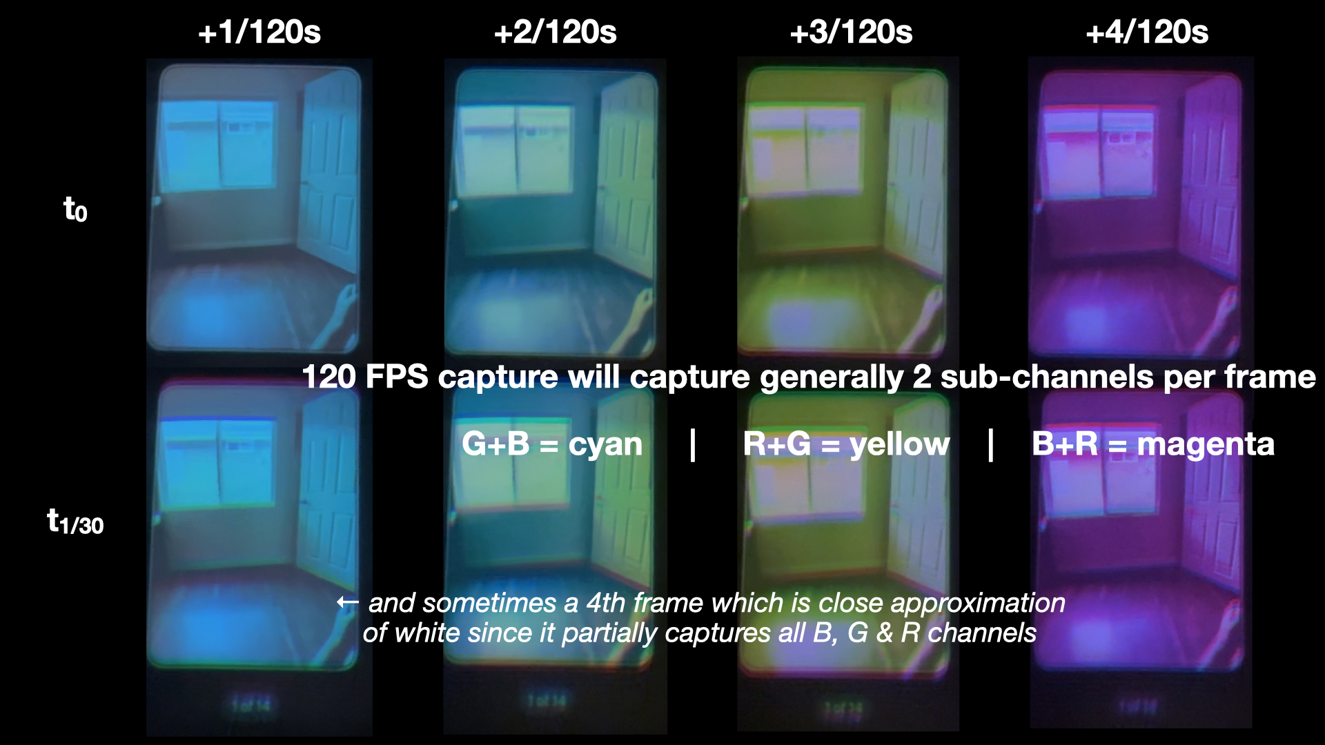 Essentially, the colors themselves are generated sequentially by strobing the individual blue, green, and red LEDs once every ~11ms – this light is then reflected off the LCOS panel (more on that later) which helps modulate the individual level of each color within each pixel, ultimately adding these three primary colors together within each pixel to form the target color… this works great for static situations like a projector on a wall or screen, but with some motion our eyes can detect one of these ‘sub-frames’ (either just the blue, green or red channel) in a different spatial coordinate due to the significant input lag between light emission from the display and the photostimulation of our color receptor cells. The reason we can partially capture these individual colors with a camera sometimes is due to short capture times (e.g. ~8.3ms for a 120Hz high-speed iPhone capture) – the timing diagram below shows how individual green, blue and red frames may be generated in an 11ms window, and how an 8.3ms capture will generally capture either 2 full color sub-frames plus a small amount of the third (creating yellow, cyan or magenta frames), or a little of all 3 colors creating a mostly full-color image. Complicated!