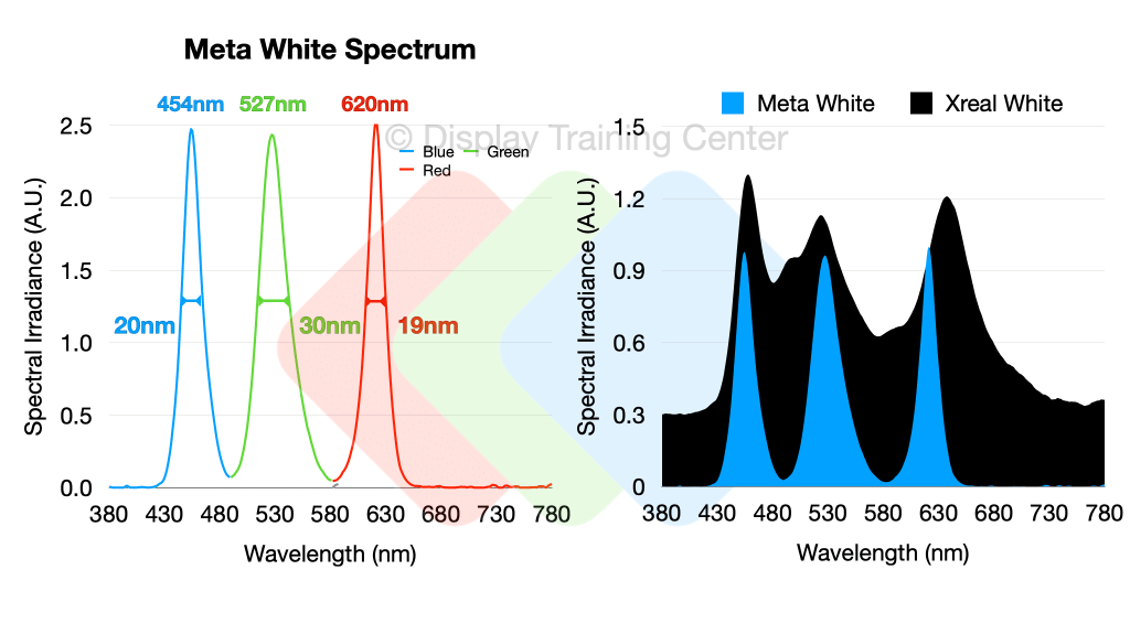 When we measured Meta’s spectral output, we can see the individual LEDs that are the sources used for the reflected LCOS image – the LEDs are incredibly pure emitters, with FWHMs of ~20nm for blue and red, and ~30nm for green. This color purity is also maintained well through the waveguide which is reflective, therefore not adding too much noise through the diffractive elements that can sometimes reduce this purity – you can see just how much more narrow the color emission is vs. OLED in a head-to-head comparison of the Sony panel used in the Xreals below.