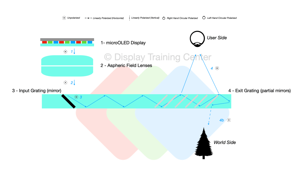 The optical path of the INMO Air is actually very simple – all we are doing is focusing the image from a microOLED panel into a reflective waveguide, which uses a series of partially reflective mirrors (4) to reflect the image back out to the user’s eye. This is a very simple design and very efficient when compared to the diffractive waveguides on the Go line, which is absolutely a requirement given we’re working with a 3000 nit max display panel vs. the 200k nit green microLED in the Go…