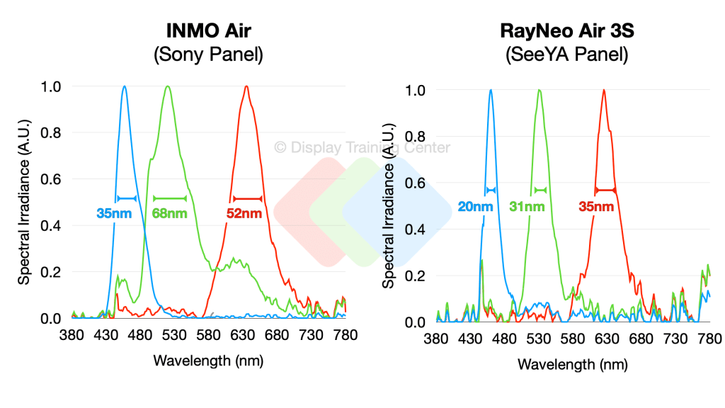 I hate to harp on the panel emission again, but it’s an intrinsic fact that these commercial Sony panels are just using an older emitter technology – you can see the characteristic wide-peaks in green and red are almost 2X the FWHM of the SeeYA panels that I’ve only found in the RayNeo devices. It’s possible that the INMO Air 3 will also use these panels since they claim a larger color volume, but we’ll have to verify that next time…