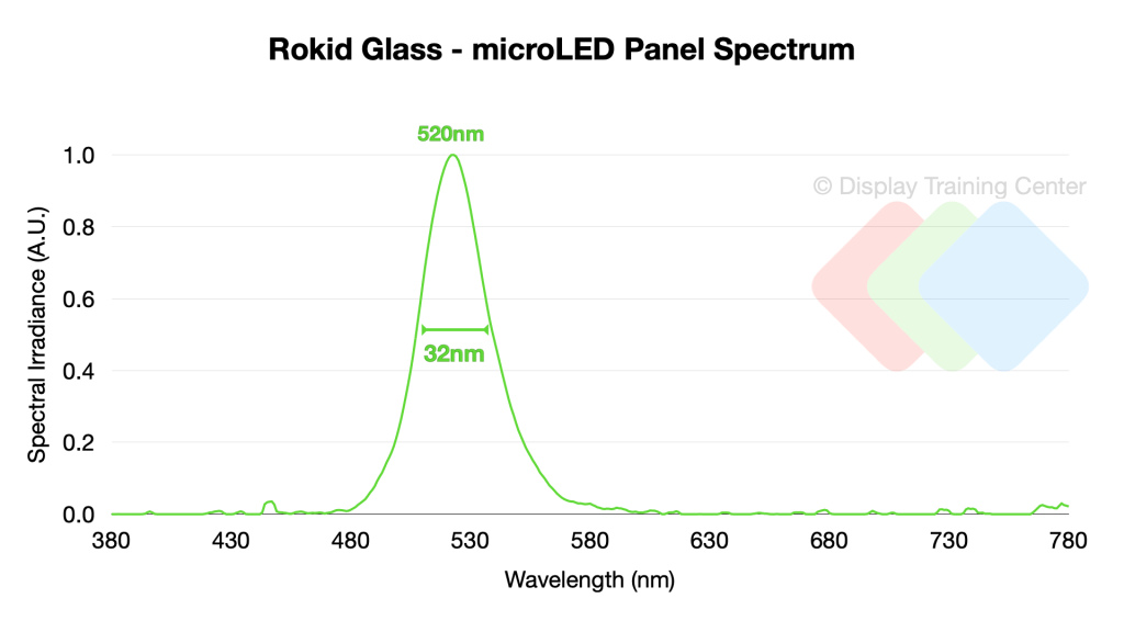 The display panel is not really a surprise here – Rokid chose to go with the well known (and essentially only supplier to the major brands) JBD Hummingbird 0.13″ display. Color purity wise, we get our expected green peak at 520nm with a very good 32nm FWHM, which is to be expected given the inorganic LEDs being used.