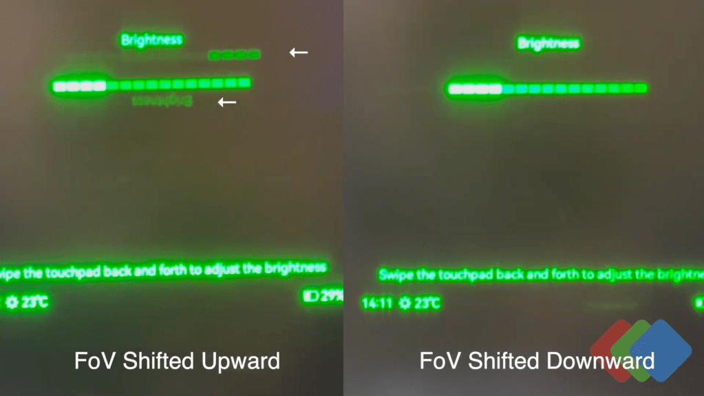 One issue I did find during testing was with the digital image location adjustment. What Rokid did great was reserve some of the vertical pixels use in the UI so that the entire image can be DC shifted either up or down to accommodate a larger eyebox depending on how the nose-pads sit on a user’s nose. At the extreme down-shift, the image is as expected – however if you shift the entire FoV up to the maximum allowed via software, there does seem to be a double image generated within the waveguide. You can see this in the brightness menu below where the brightness bar is at the top of the FoV, and they now create a mirrored & flipped second image noted by the white arrows.